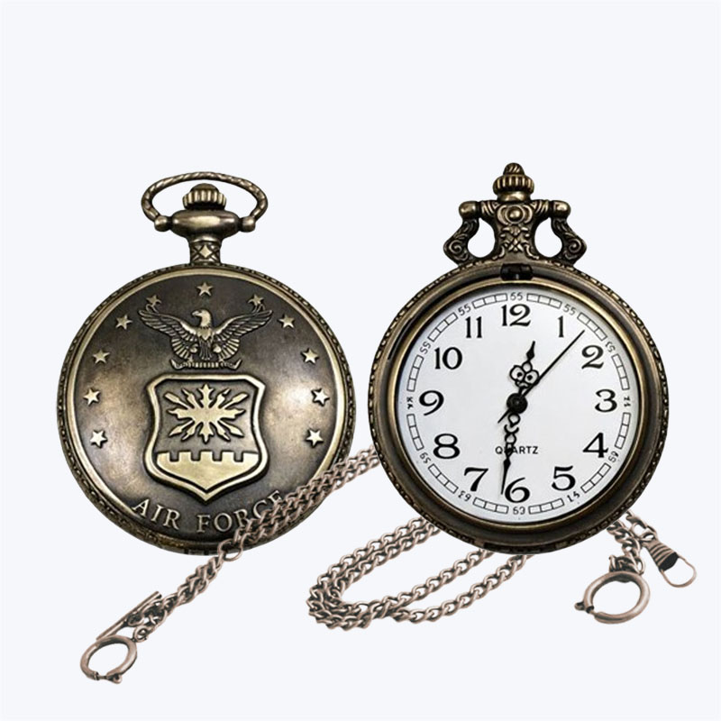 Air Force Pocket Watch designed as a classic military keepsake with detailed front cover artwork, traditional interior watch face, and included chain for display, gifting, or everyday carry.
