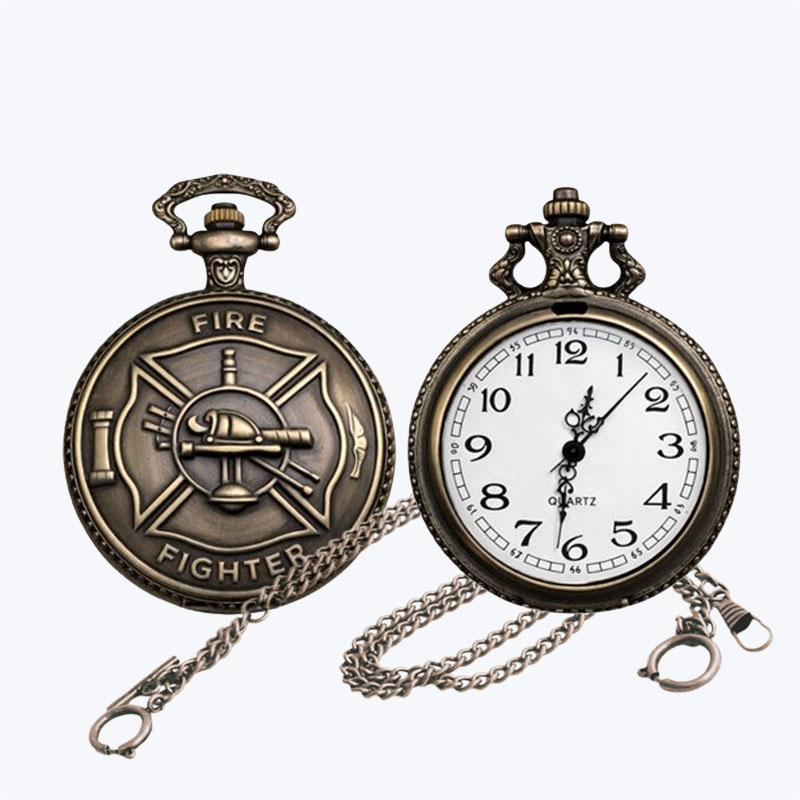 Fire Department Pocket Watch designed as a classic first responder keepsake with detailed front cover artwork, traditional interior watch face, and included chain for display, gifting, or everyday carry.